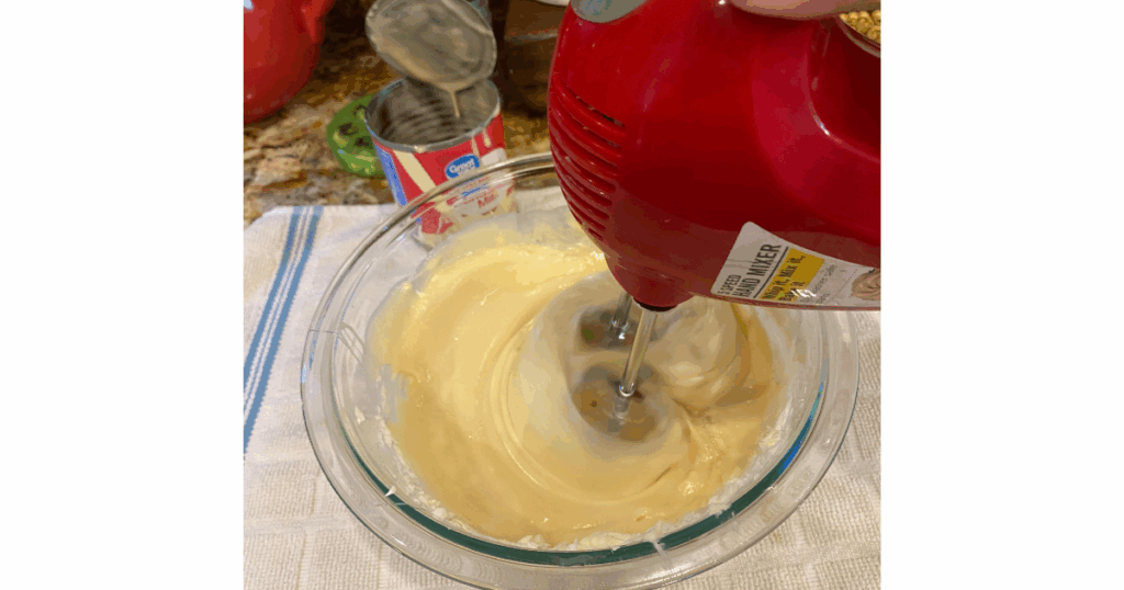 - Add the sweetened condensed milk and beat until well combined and creamy.